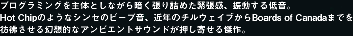 サウンドエンジニアとしてスチャダラパー・SLY MONGOOSE等を手がける佐藤宏明(molmol)を迎え、プログラミングを主体としながら暗く張り詰めた緊張感、振動する低音。Hot Chipのようなシンセのビープ音、近年のチルウェイブからBoards of Canadaまでを彷彿させる幻想的なアンビエントサウンドが押し寄せる傑作。